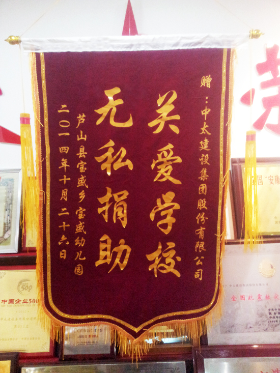 12月12日上午,中太建設(shè)集團(tuán)收到來(lái)自四川蘆山縣寶盛鄉(xiāng)幼兒園送來(lái)的錦旗,其內(nèi)容為“關(guān)愛(ài)學(xué)校無(wú)私捐助”,以感謝集團(tuán)公司在幼兒園援建工作中做出的貢獻(xiàn)。