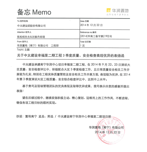 近日,華潤(rùn)置地(南寧)有限公司發(fā)來(lái)表?yè)P(yáng)函,以表?yè)P(yáng)集團(tuán)公司在幸福里二期工程三季度質(zhì)量、安全檢查中的優(yōu)異表現(xiàn)。