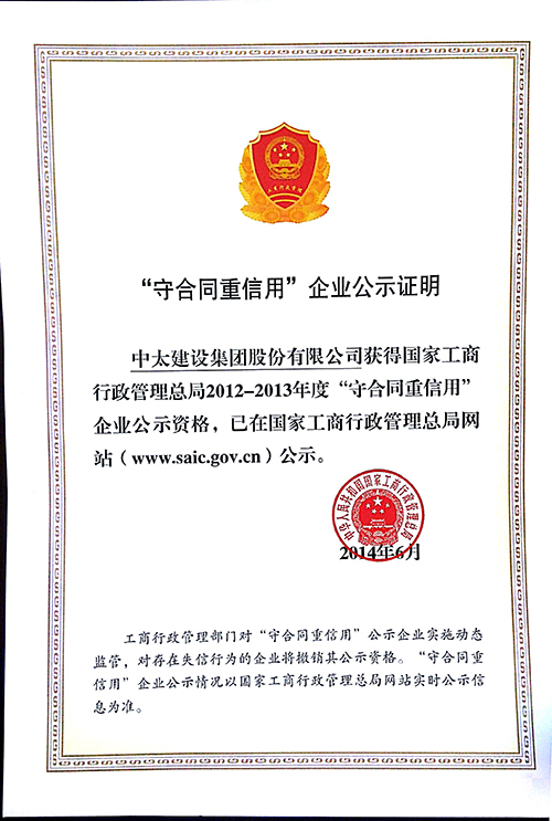 日前,由國(guó)家工商總局傳來(lái)消息,包括中太建設(shè)集團(tuán)在內(nèi)的5035家企業(yè)獲得國(guó)家工商總局2012-2013年度“守合同重信用”企業(yè)公示資格,這也是集團(tuán)公司首次榮獲中國(guó)企業(yè)信用的最高榮譽(yù)。