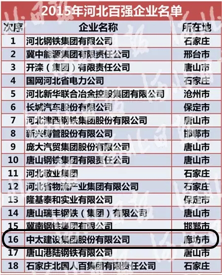 近日,由河北省工業(yè)經(jīng)濟(jì)聯(lián)合會主辦,省企業(yè)家協(xié)會、省企業(yè)聯(lián)合會和省統(tǒng)計學(xué)會協(xié)辦的2015年河北百強(qiáng)企業(yè)排序活動圓滿落幕,經(jīng)層層評選審核、專家評審和社會公示等程序,最終揭曉結(jié)果。中太建設(shè)集團(tuán)再次榮膺“河北百強(qiáng)企業(yè)”(第16名),并在“河北省重點(diǎn)行業(yè)排頭兵企業(yè)”排名中榮獲建筑業(yè)第1名。