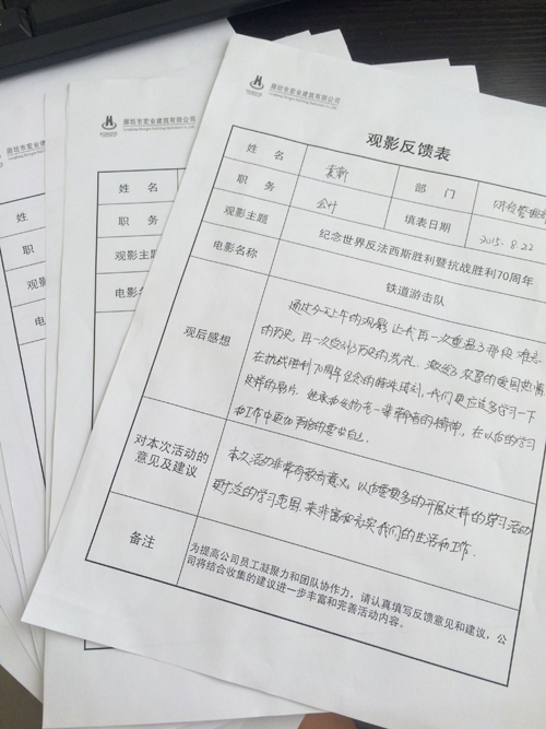 2015年8月22日,為紀(jì)念反法西斯戰(zhàn)爭勝利70周年,宏業(yè)公司組織全體員工進(jìn)行了一次革命傳統(tǒng)教育活動,觀看了電影《鐵道游擊隊》,一同回顧了那段血淚鑄成的抗戰(zhàn)史,共同緬懷先烈們的英靈。