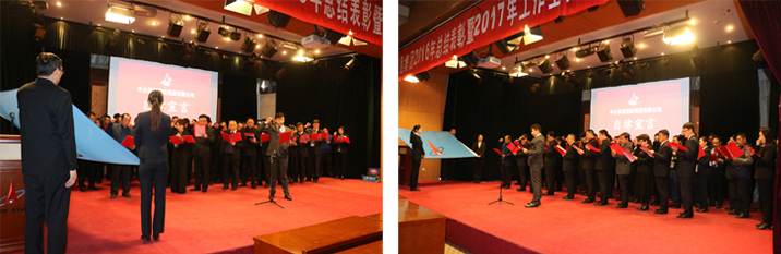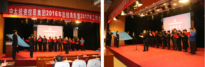 根據(jù)會議安排,中太建設(shè)集團副董事長燕振義、總裁吳建國作為領(lǐng)誓人,分別引領(lǐng)中太投資控股集團下屬單位董事、監(jiān)事及中層以上領(lǐng)導干部進行自律宣誓,宣誓人分別在誓詞上簽字,并承諾2017年將恪盡職守、奮發(fā)向上,全身心投入到企業(yè)發(fā)展上來,做合格的企業(yè)引領(lǐng)人和決策者。