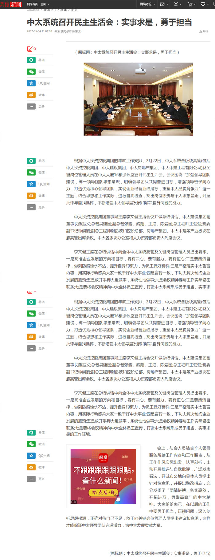 網易新聞報道了“中太系統(tǒng)召開民主生活會:實事求是,勇于擔當”