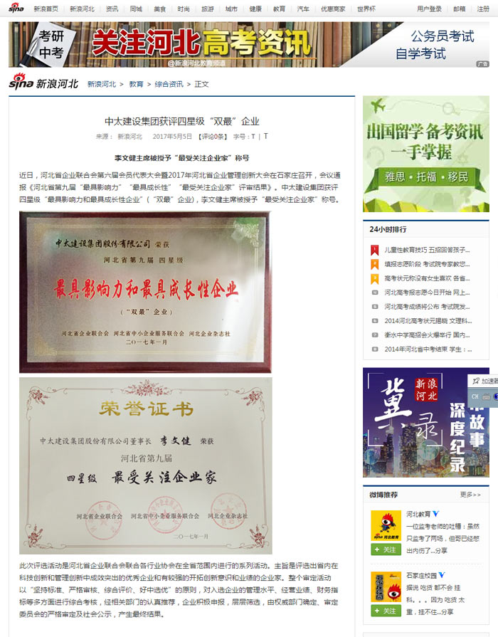 新浪網(wǎng)報道了“中太建設(shè)集團(tuán)獲評四星級“雙最”企業(yè)”