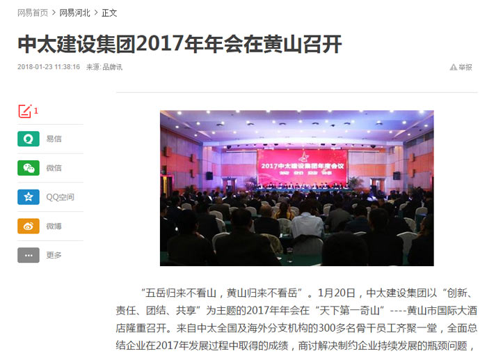 網(wǎng)易報(bào)道了“中太建設(shè)集團(tuán)2017年年會(huì)在黃山召開(kāi)”