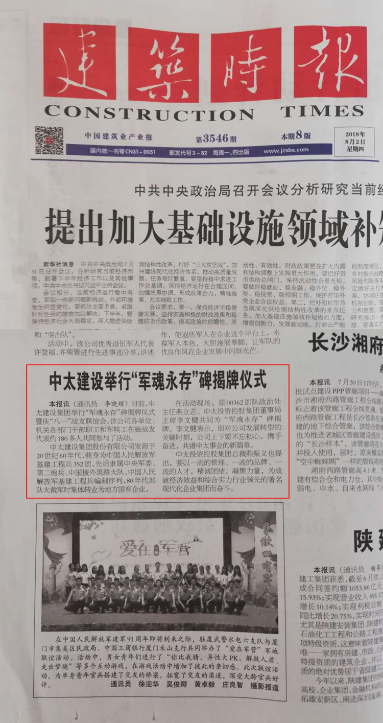 建筑時(shí)報(bào)8月2日?qǐng)?bào)道了“中太建設(shè)集團(tuán)“軍魂永存”碑揭牌儀式”