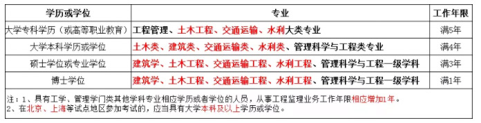 具有工程技術(shù)或工程經(jīng)濟專業(yè)大專以上(含大專)學(xué)歷,并符合下列條件之一者,可申請參加監(jiān)理工程師執(zhí)業(yè)資格考試。