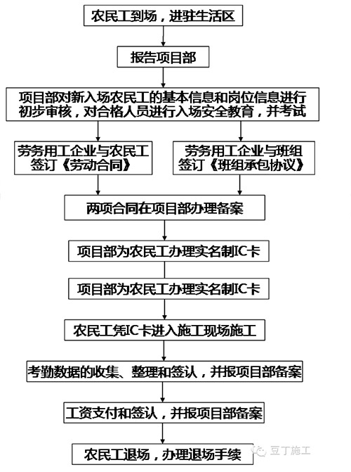 一、公司成立勞務(wù)管理中心,加強(qiáng)各相關(guān)職能部門(mén)的監(jiān)督與協(xié)作;分公司參照公司勞務(wù)管理中心機(jī)構(gòu)和人員配置,必須成立分公司勞務(wù)管理中心,并配備勞務(wù)中心主任和相應(yīng)的管理人員。主任:公司分管勞務(wù)領(lǐng)導(dǎo) 組員:公司經(jīng)濟(jì)管理部、財(cái)務(wù)部、安全管理部、質(zhì)量技術(shù)部、法律事務(wù)部、政工部等部門(mén)負(fù)責(zé)人,公司勞務(wù)管理員、分公司勞務(wù)管理中心主任,各項(xiàng)目部。 項(xiàng)目部勞務(wù)管理機(jī)構(gòu)項(xiàng)目經(jīng)理部必須成立勞務(wù)管理領(lǐng)導(dǎo)小組,項(xiàng)目部勞務(wù)管理領(lǐng)導(dǎo)小組主要人員設(shè)置及要求如下:1、項(xiàng)目經(jīng)理為項(xiàng)目勞務(wù)管理工作的第一責(zé)任人。2、項(xiàng)目部必須設(shè)置一名副職以上人員作為勞務(wù)管理工作的第二責(zé)任人,其專(zhuān)職或兼職主管勞務(wù)日常管理工作。3、項(xiàng)目部使用勞務(wù)分包企業(yè)人員500人以上,必須設(shè)置專(zhuān)職勞務(wù)管理員1-4名;500人以下100人以上,必須設(shè)置至少1名專(zhuān)職勞務(wù)管理員;100人以下必須設(shè)置兼職勞務(wù)管理人員。 勞務(wù)管理員的薪酬不低于項(xiàng)目責(zé)任工程師的薪酬標(biāo)準(zhǔn)。4、項(xiàng)目勞務(wù)管理不只是勞務(wù)管理員的職責(zé),項(xiàng)目部相關(guān)部門(mén)必須直接參與勞務(wù)日常管理工作;各項(xiàng)目部根據(jù)項(xiàng)目實(shí)際情況,編制《項(xiàng)目勞務(wù)管理方案》,根據(jù)各項(xiàng)任務(wù)分解,方案中必須明確勞務(wù)管理領(lǐng)導(dǎo)小組成員和崗位職責(zé),以及應(yīng)急預(yù)案。5、勞務(wù)分包合同中須明確約定現(xiàn)場(chǎng)各分包隊(duì)伍必須設(shè)置一名以上專(zhuān)職勞務(wù)管理員。一、做好農(nóng)民工進(jìn)場(chǎng)施工前的各項(xiàng)手續(xù)1、如何做到勞務(wù)分包隊(duì)伍自覺(jué)向項(xiàng)目部申報(bào)施工人員進(jìn)場(chǎng)情況的關(guān)鍵是:現(xiàn)場(chǎng)封閉管理——沒(méi)有按規(guī)定辦理手續(xù)堅(jiān)決不能進(jìn)入施工現(xiàn)場(chǎng)。2、七天內(nèi)辦理好以下相關(guān)手續(xù),考慮到現(xiàn)場(chǎng)施工和減少作業(yè)人員等待時(shí)間的需要,可以優(yōu)先上報(bào)花名冊(cè)和辦理IC卡,但其他手續(xù)辦理完成以7天為管理底線。3、《勞動(dòng)合同》是國(guó)家《勞動(dòng)合同法》明文規(guī)定要簽訂的,但建筑行業(yè)農(nóng)民工群體執(zhí)行普遍不好,但涉及到勞務(wù)糾紛時(shí),政府是依照《勞動(dòng)合同》辦理。《班組承包協(xié)議》不同于集體合同,是民間行為,目前階段以及政府為了維穩(wěn),該協(xié)議是不受法律保護(hù)的,但大部分老板與作業(yè)人員在建立相互信任、協(xié)商的基礎(chǔ)上,基本上都是按照班組承包協(xié)議辦理結(jié)算。4、安全入場(chǎng)教育及考試等也是《勞動(dòng)合同法》中要求施工企業(yè)做到的 。