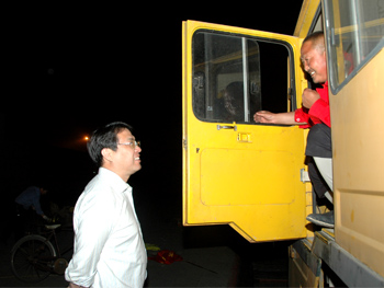 5月16日深夜,省建設廳副巡視員梁軍來到石家莊鐵路東貨場,慰問即將奔赴四川地震災區(qū)的河北建設搶險隊押車隊員。