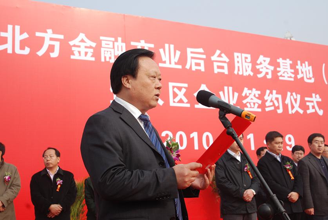 11月19日,經(jīng)河北省人民政府批準,河北省“中國北方金融產(chǎn)業(yè)后臺服務(wù)基地(A區(qū))”在中太現(xiàn)代服務(wù)業(yè)基地正式掛牌。省長助理、省金融辦主任江波、廊坊市市委書記趙世洪出席揭牌及入?yún)^(qū)項目簽約儀式并為基地揭牌。市長王愛民講話。市政府常務(wù)副市長吳立方、市委常委、組織部長范永錄等省市縣相關(guān)部門領(lǐng)導(dǎo)出席儀式。揭牌儀式由永清縣委書記布澤文主持。