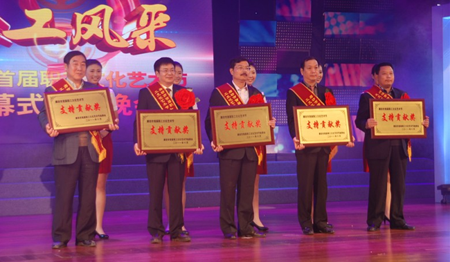 10月26日晚,廊坊市總工會(huì)在廊坊管道局影劇院隆重舉辦“職工風(fēng)采”廊坊市首屆職工文化藝術(shù)節(jié)閉幕式頒獎(jiǎng)晚會(huì)。市委副書記吳曉琳等市領(lǐng)導(dǎo)到場觀看演出,并為獲獎(jiǎng)人員頒獎(jiǎng)。中太建設(shè)集團(tuán)等五家單位榮獲藝術(shù)節(jié)“支持貢獻(xiàn)獎(jiǎng)”。受集團(tuán)董事局主席、黨委書記李文健委托,工會(huì)主席、黨委副書記鐘崇鶴(中)代表集團(tuán)上臺(tái)領(lǐng)獎(jiǎng)。從5月到10月首屆職工文化藝術(shù)節(jié)期間,市總工會(huì)會(huì)同相關(guān)部門共組織了十大系列100項(xiàng)活動(dòng),其中組織各項(xiàng)比賽500余場次,2萬余名職工參加,取得了豐碩成果。 |