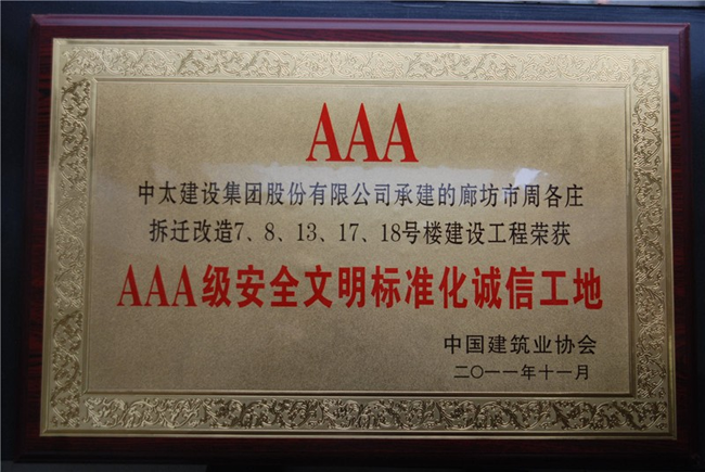 近日,中國建筑業(yè)協(xié)會發(fā)布2011年全國 AAA級安全文明標準化誠信工地評定名單,中太建設(shè)集團承建的廊坊市周各莊拆遷改造7、8、13、17、18號樓建設(shè)工程獲評2011年全國 AAA級安全文明標準化誠信工地。