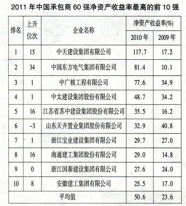 在“2011年中國承包商60強(qiáng)凈資產(chǎn)收益率最高的前10強(qiáng)”中,民營企業(yè)獨(dú)占鰲頭(國有企業(yè)僅占3家)。 |