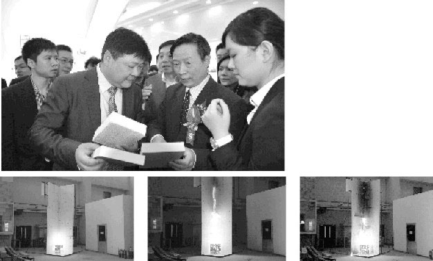 上圖:上海雅達(dá)特種涂料有限公司董事長顧衛(wèi)星(前左)在京向住建部領(lǐng)導(dǎo)和專家介紹創(chuàng)新產(chǎn)品聚合聚苯板的性能和特點