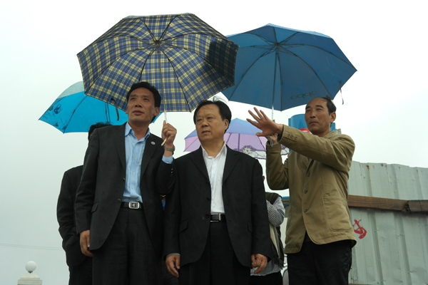 董事局主席李文健(中)在安徽分公司總經(jīng)理陳德剛(左)的陪同下,冒雨視察項目工地