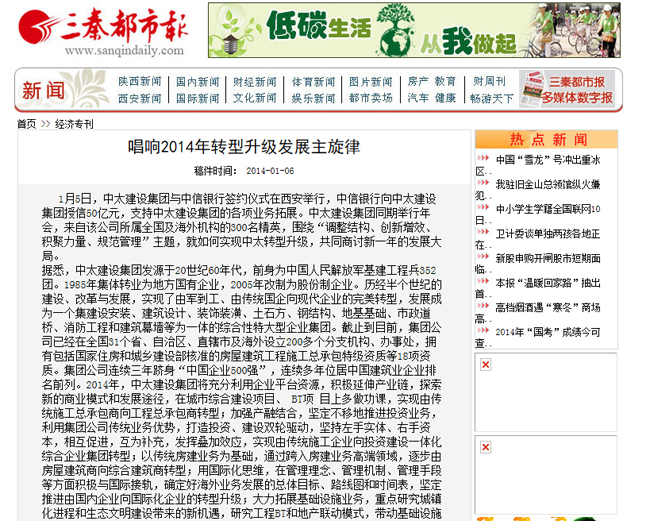 三秦都市報報道了中太建設集團唱響2014年轉(zhuǎn)型升級發(fā)展主旋律