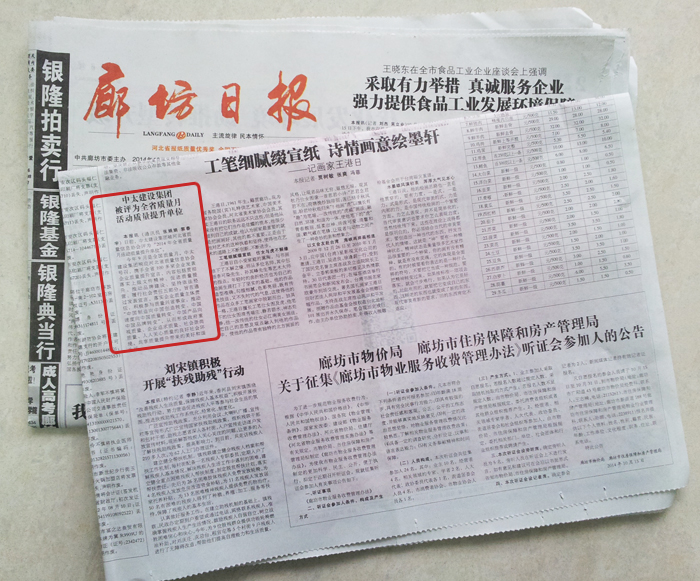 廊坊日報報道了中太建設(shè)集團(tuán)被評為全省質(zhì)量月活動質(zhì)量提升單位