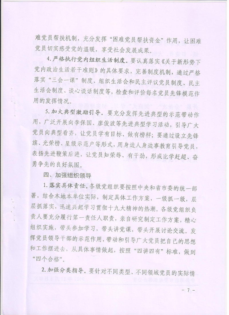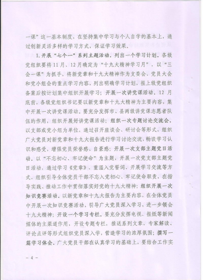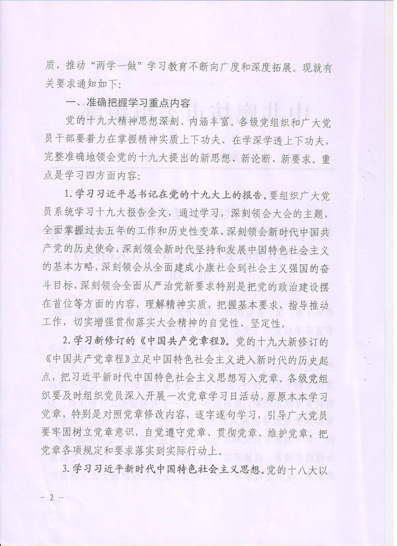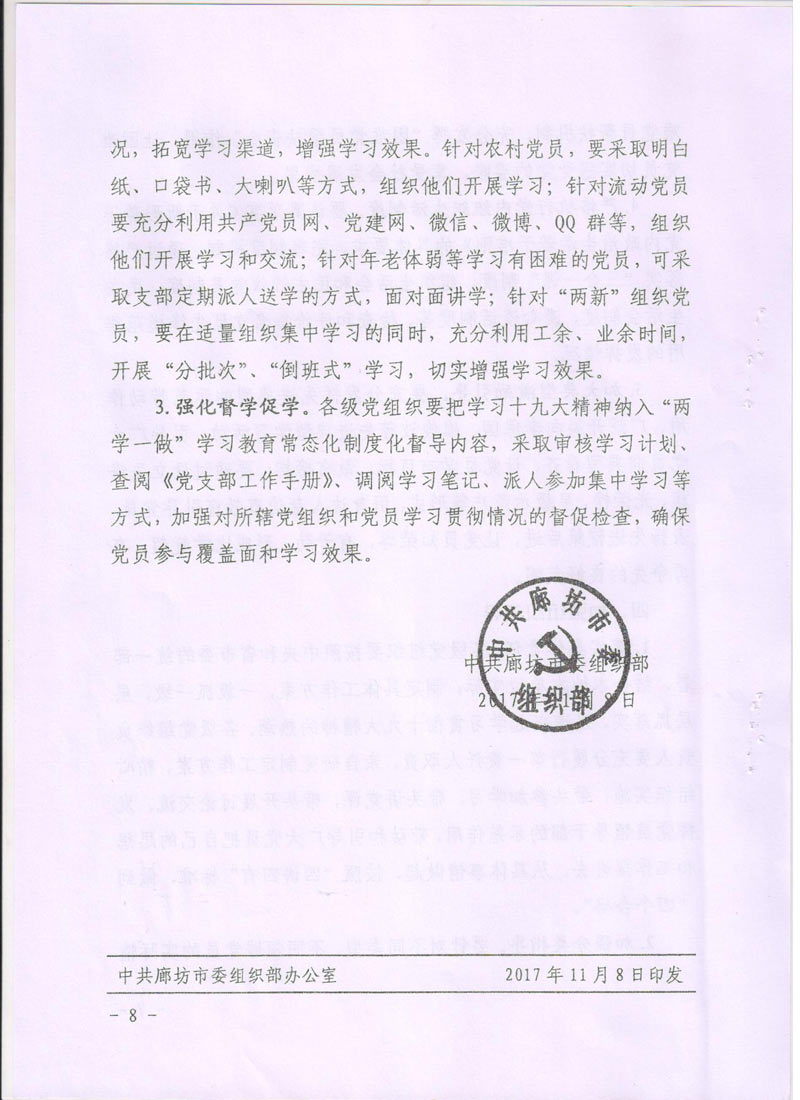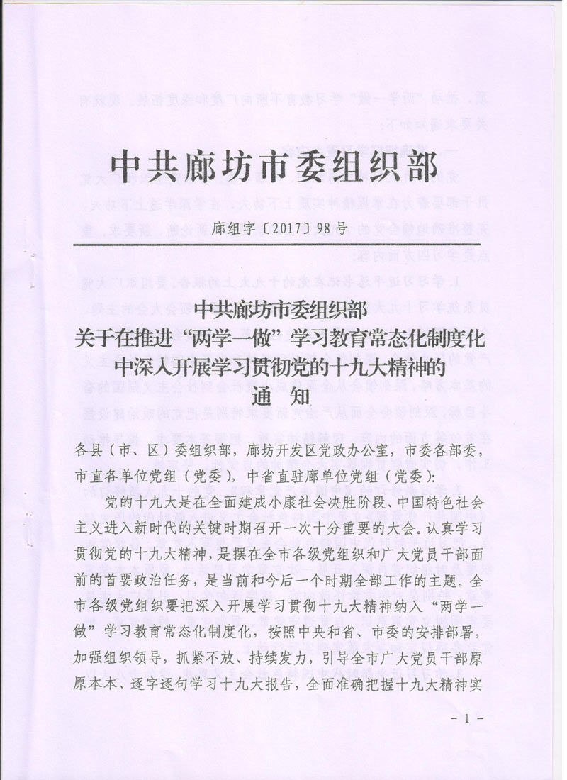 現(xiàn)將中共廊坊市委組織部《關(guān)于在推進(jìn)“兩學(xué)一做”學(xué)習(xí)教育常態(tài)化制度化中深入開(kāi)展學(xué)習(xí)貫徹黨的十九大精神的通知》轉(zhuǎn)發(fā)給你們。請(qǐng)認(rèn)真按照通知要求,緊密聯(lián)系本單位實(shí)際,把深入開(kāi)展學(xué)習(xí)貫徹十九大精神納入“兩學(xué)一做”學(xué)習(xí)教育常態(tài)化制度化,把十九大精神學(xué)深學(xué)透,全面把握十九大精神實(shí)質(zhì)。